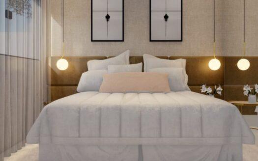 Três quartos, sendo uma suíte; três vagas de garagem.